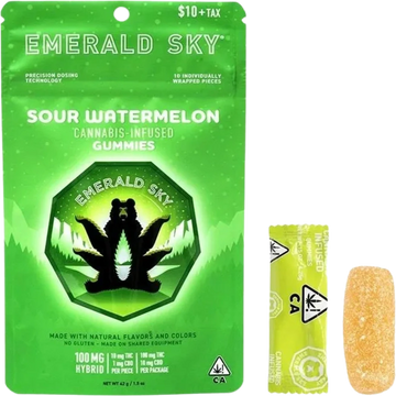 EMERALD SKY GUMMIES 100MG, MADE WITH NATURAL FLAVORS AND COLORS. 10 INDIVIDUALLY WRAPPED PIECES.