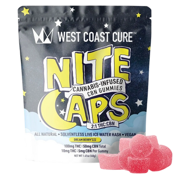 WEST COAST CURE CANNABIS INFUSED CBN GUMMIES. ALL NATURAL, VEGAN GUMMIES. MADE WITH CHAMOMILE & LAVENDER. 10MG THC- 5MG CBN PER GUMMY