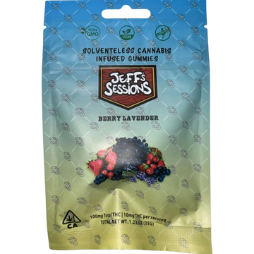 JEFFS SESSIONS SOLVENTLESS CANNABIS INFUSED GUMMIES. NON GMO,VEGAN AND GLUTEN FREE! 100MG THC. 10MG THC PER SERVING.