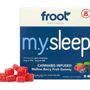 M.Y. Sleep by Froot is specially developed to Make You Sleep. M.Y. Sleep is formulated with THC, CBN and PhytoMelatonin ro give your body and mind the sleep you deserve. M.Y. Sleep uses only the highest quality ingredients to ensure an effective, great tasting and consistently dosed gummy. Fall asleep, stay asleep and wake up feeling refreshed. Get the sleep you deserve, m.y. sleep. 20 pieces each with 5mg THC, 2mg CBN, 2mg Phytomelatonin (100mg total THC, 40mg total CBN, 40mg total PhytoMelato