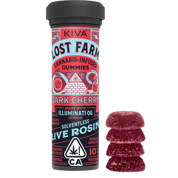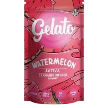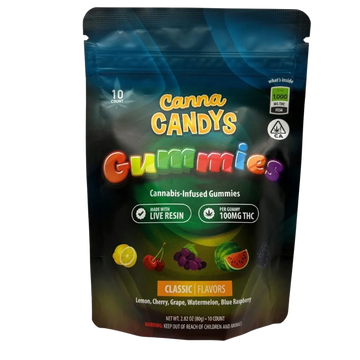 Bag of 10 live resin 100mg gummies with 2 lemon, 2 watermelon, 2 cherry, 2 grape and 2 blue razberry flavors.