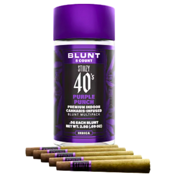 STIIIZY 40’s Mini Blunts Multipack is filled with premium grown STIIIZY cannabis and packed in individual glass vials to maintain freshness and potency. Each 40’s Mini Blunt is rolled with 100% tobacco free, kief dusted hemp wraps.